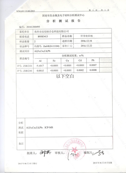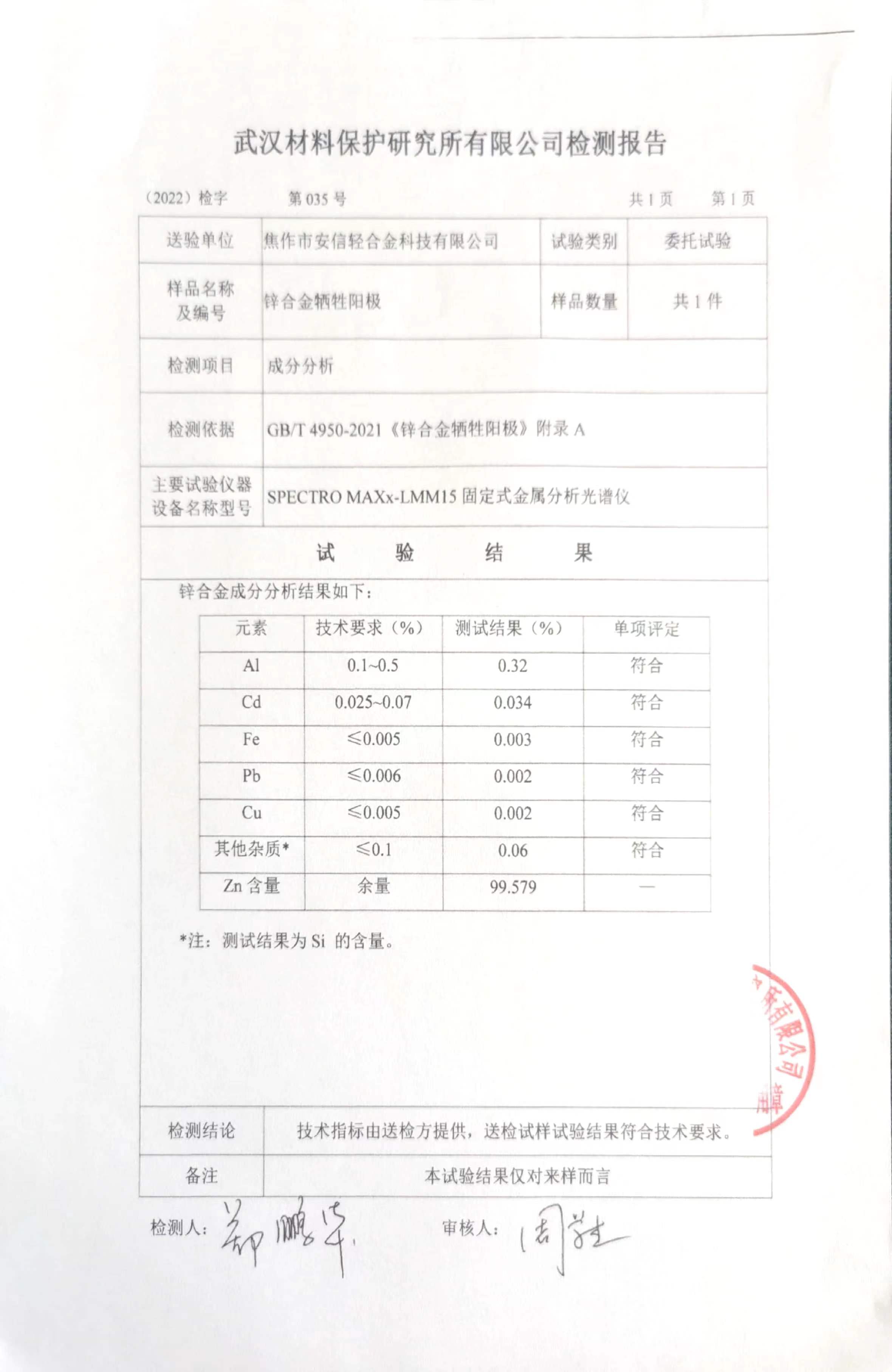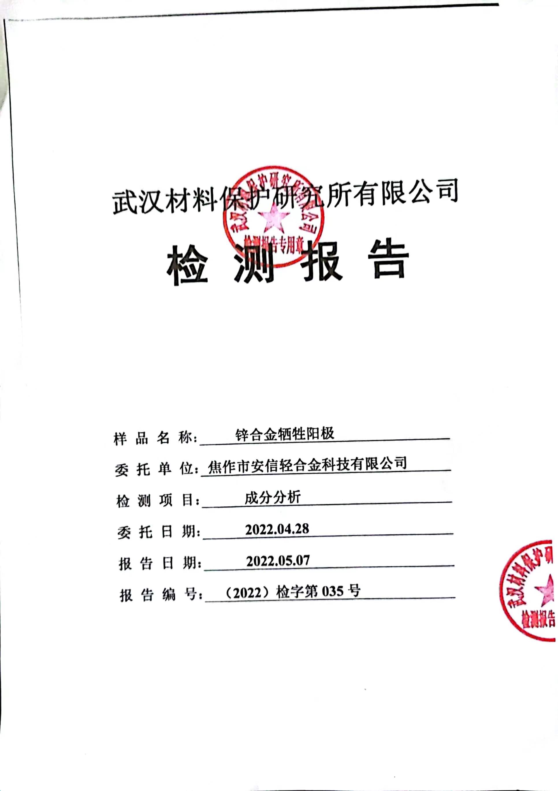 鋅合金犧牲陽(yáng)極檢驗(yàn)報(bào)告